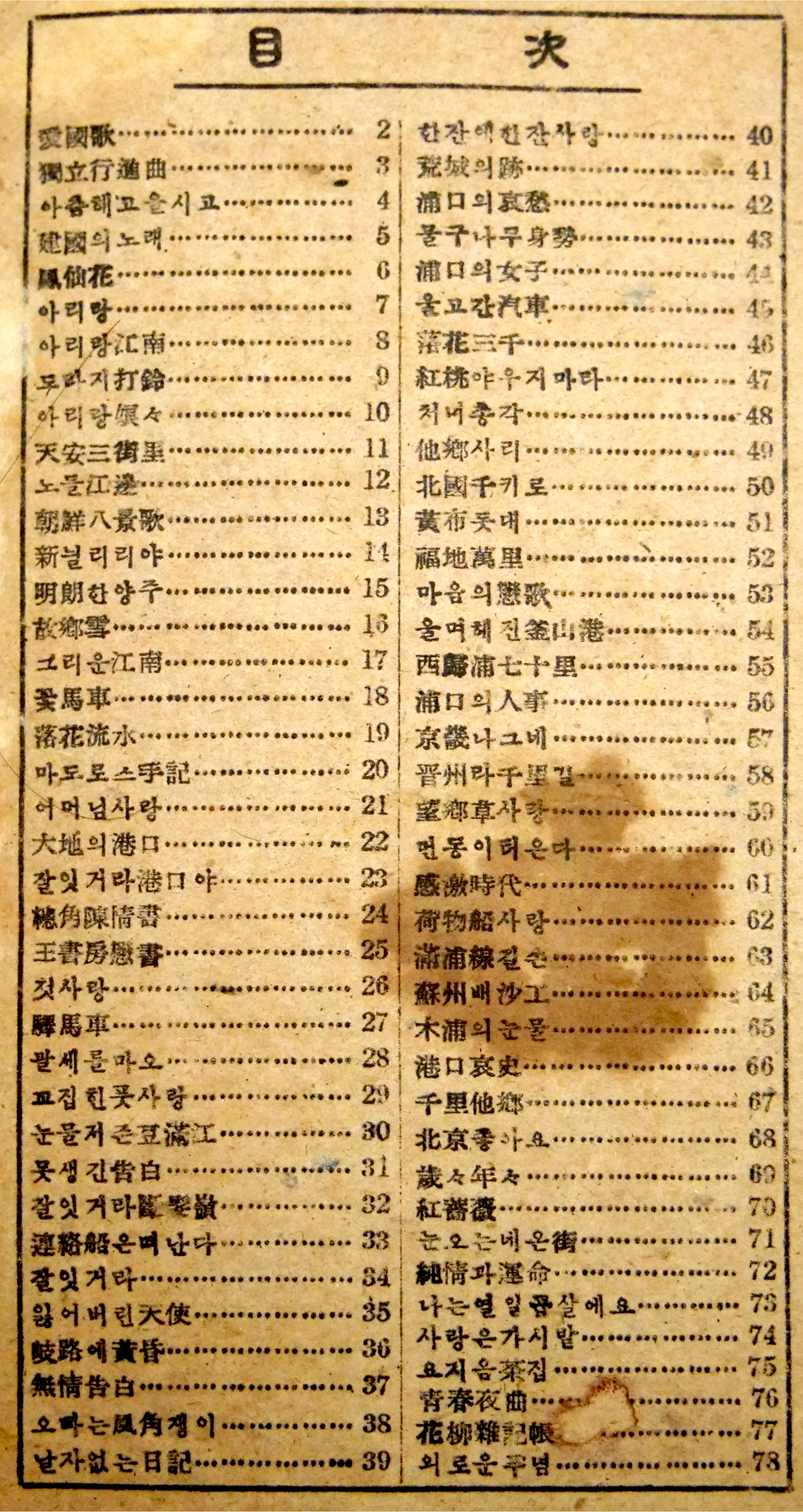 1946년 발행된 애창가요명곡집은 「애국가」를 시작으로 「독립행진곡」, 「봉선화」, 「아리랑」, 「아리랑 낭낭」, 「오빠는 풍각쟁이」, 「목포의 눈물」, 「나는 열일곱 살이에요」, 「청춘야곡」 등 78곡이 수록되어 있다.