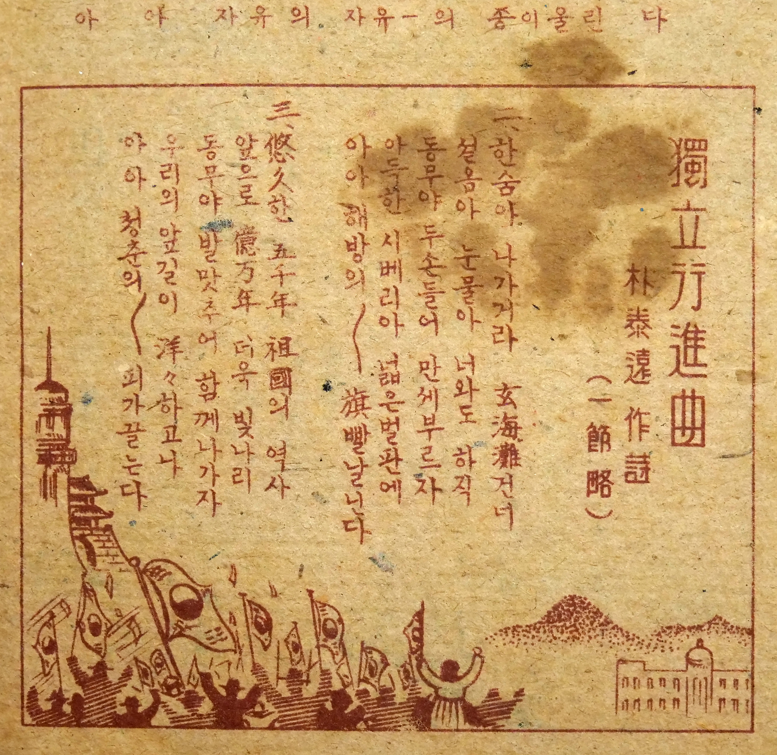 「독립행진곡」은 1946년 박태원이 작사하고 김성태가 작곡한 노래로 1946년 2월, 조선국민음악연구회가 편집하고 발행한 해방기념 애국가집에 처음 수록되었다. 평범한 장조 5음계의 행진곡으로 광복의 감격과 미래에 대한 밝은 전망과 실천의 독려를 담고 있다. 이른바 ‘해방가요’의 하나로 가장 대중적으로 알려져 1990년대 중반까지 대학생에게 민중가요로 살아남았다.