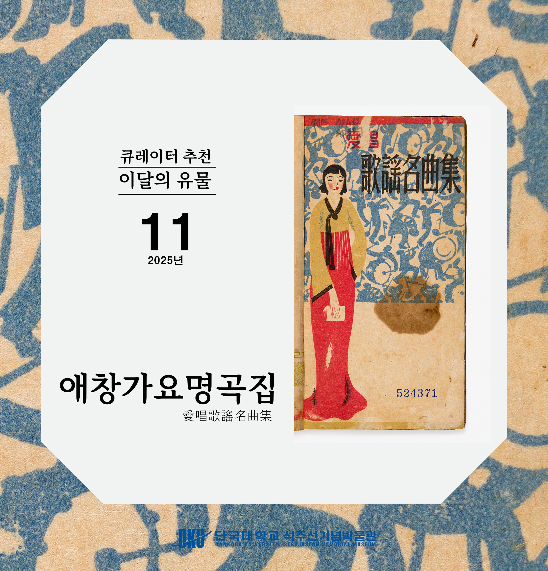참고. 한국민족문화대백과사전 단국대학교 석주선기념박물관 특별전 ‘한국 가곡을 들으셔’ 한편, 단국대학교 석주선기념박물관에서는 음악의 힘을 느끼고 감상할 수 있는 ‘한국의 가곡을 들으셔’ 특별전이 열리고 있다. |